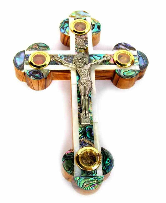 Mother of the Pearl Crucifix (on olive wood) made in Bethlehem, Size 18 x 12 cm + 4 souvenirs fr...