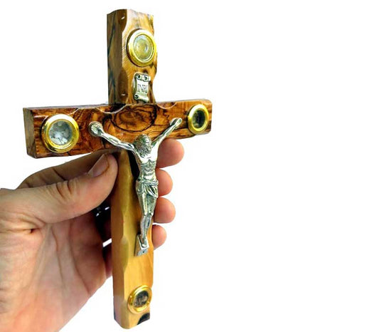Unique real-nails crucifix (Catholic) made in Jerusalem, olive wood, 4 gifts in glass windows: J...