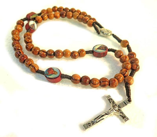 special rosary with icons- olivewood, round beads, black cotton thread, 4 icons, silver-plated c...