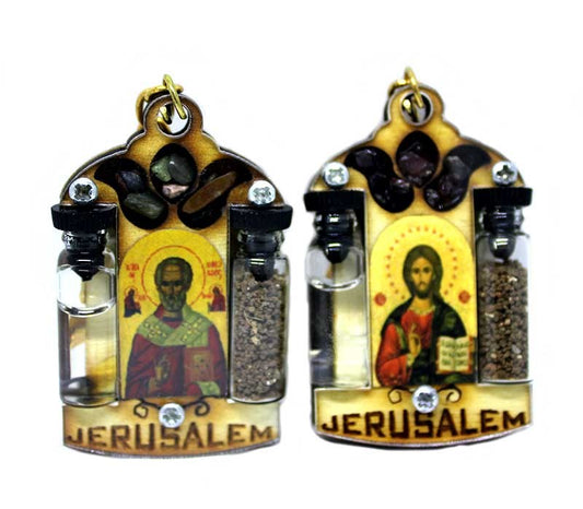 Unique key chain with soil from Jerusalem & Water the Jordan river, icon of the Holy family. ...