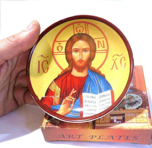 Hand-painted plate with an icon of Jesusplastic stand, wall hanger. size 10 cm, 4 inches. Free s...