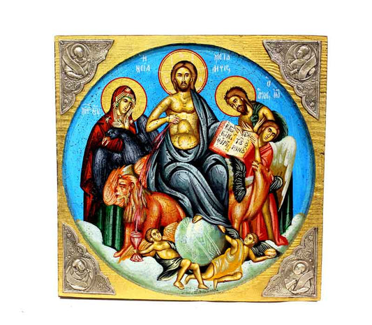 Original Jesus Christ Blessing Saints Square Icon with 925 Sterling Silver ornaments - painted o...