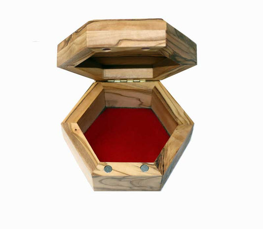 Hexagonal olive wood jewelry box, 9*9 cm. (3.5 Inches) - Shalom Dove Symbol engraved. Hand made i...