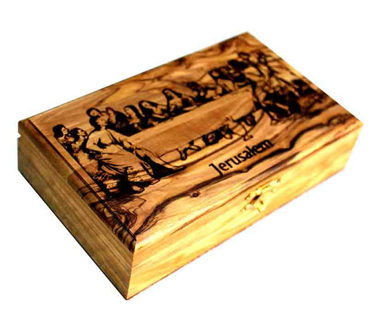Fancy olive wood jewelry box. Last Supper drawing in laser. Size 7 x 4 inches, 17.5 x 10 cm.: ins...
