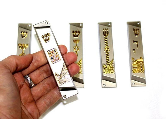 Set of 5 pewter Mezuzah case with images: Jerusalem Western Wall - הכתל המערבי Menorah - מנור...