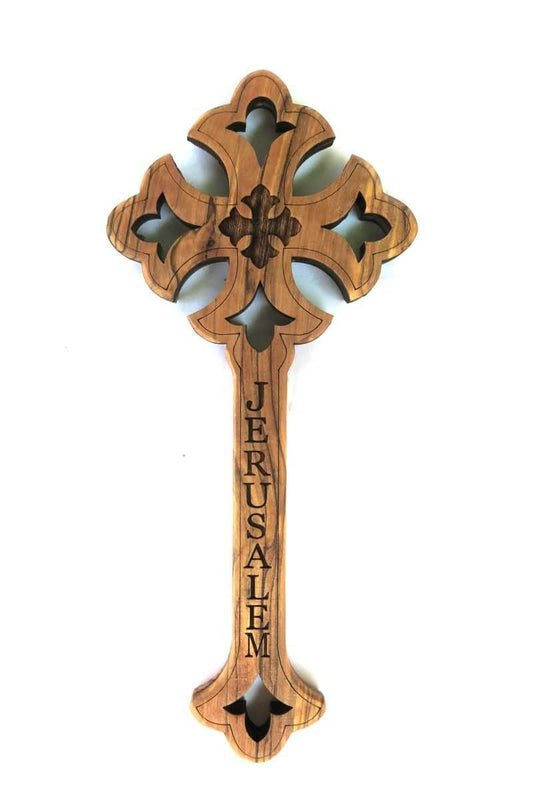 Unique olive wood palm cross, laser engraved JERUSALEM Size 20 cm, 8 inches.