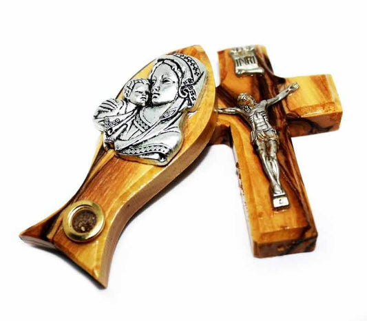 wooden Fish with Holy Maria magnet & crucifix olive wood base