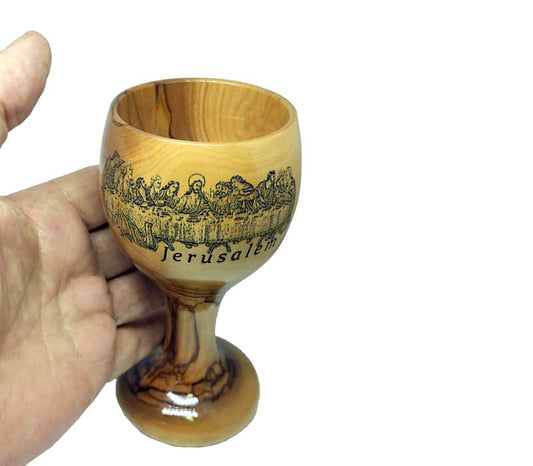 6 inches, 15 cm natural olive wood goblet, made of one piece of wood from Bethlehem. Laser carved...