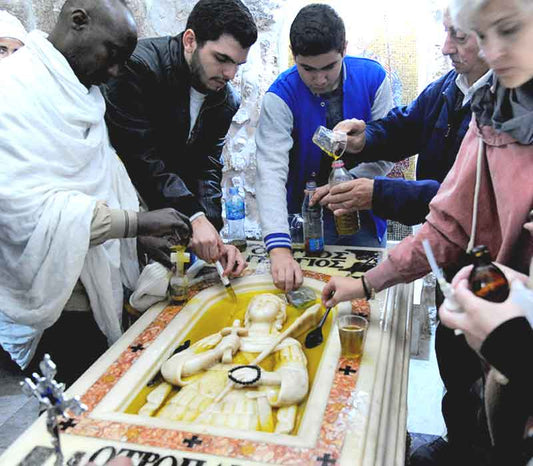 Anointing oil from the Church of the Holy Sepulchre, Jerusalem. Made from olive oil. 300 ml. A ...