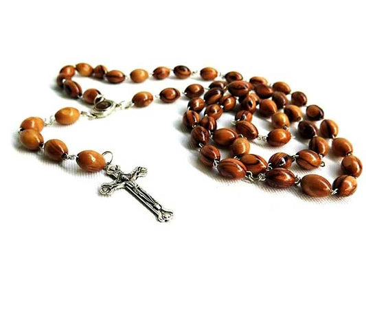 Beautiful Rosary made from olive wood oval-shaped beads, Jerusalem soil center. Beads size 9 mm, ...