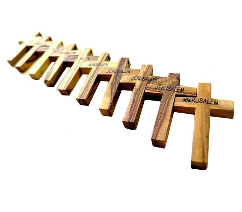 10 olive wood crosses from Bethlehem, size: 50 mm, 2 inches, "Jerusalem" print on each cross. Each cross has a hole for threading purposes.