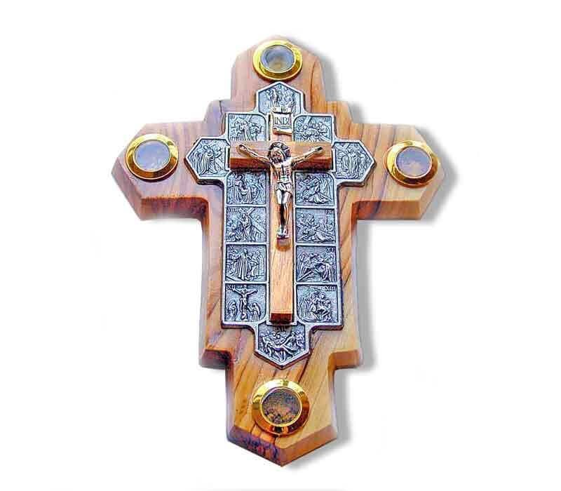 Free Shipping- original Olive wood Crucifix from Bethlehem with the Way of the Cross - Via Dolorosa - 14 stations, metal plaque and 4 souvenirs glass tubes with -, soil, stones, incense and leaves from Jerusalem. Size: 17.5 x 13 cm, 7 x 5 inch.