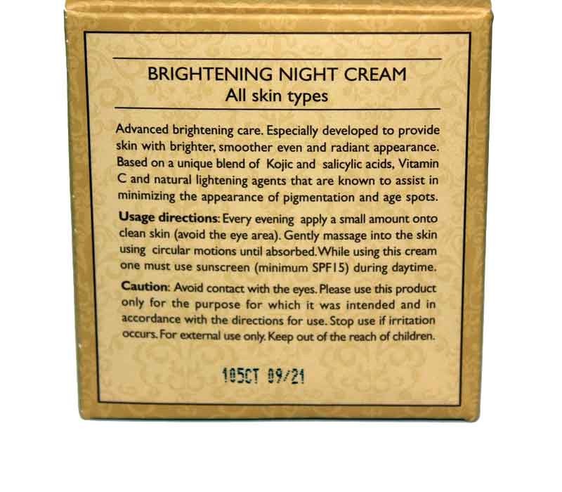 Natural all skin types Advanced brightening night care. Especially developed to provide skin with brighter, smoother even and radiant appearance. Based on a unique blend of Kojic and Salicylic acids, Vitamin C and natural lightening agents that are known to assist in minimizing the appearance of pigmentation and age spots. Made in Jerusalem.