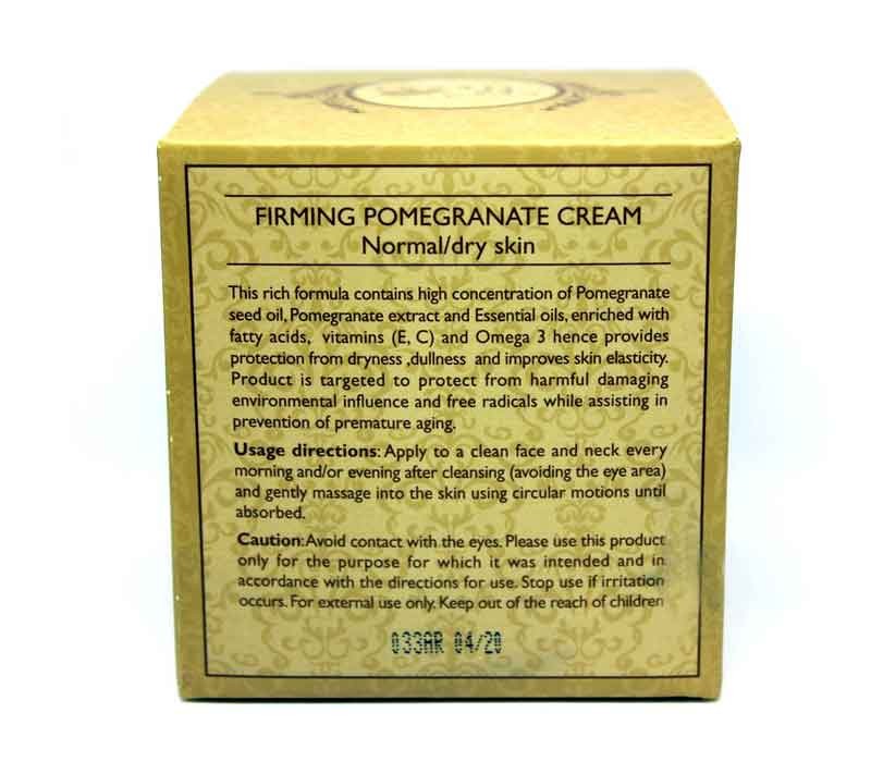 Firming Pomegranate Cream Dry Normal skin This rich formula contains a high concentration of Pomegranate seed oil, Pomegranate Extract, and Essential oils which enriched with fatty acids, vitamins( E, C) and Omega 3, that providing protection from dryness, dullness and improves skin elasticity. The product is targeted to protect from harmful damaging environmental influence and free radicals while assisting in the prevention of premature aging. contains 50 ml / 1.7 oz Original product made by "sea of herbs"