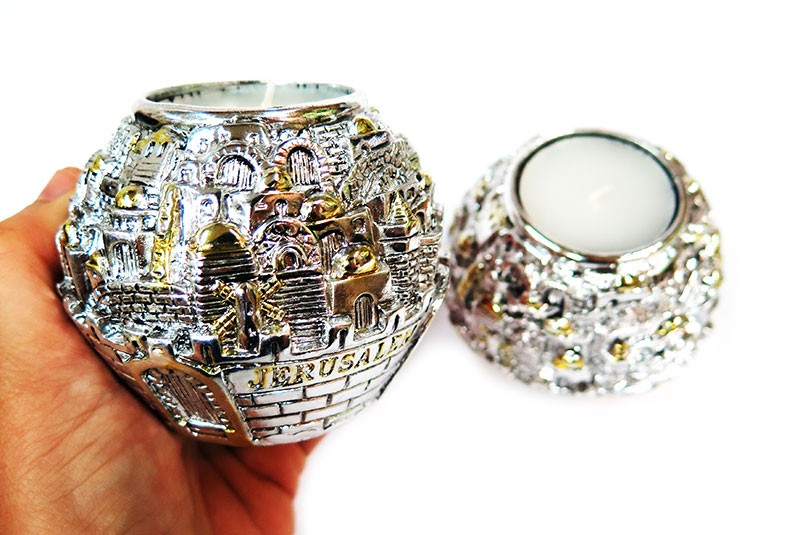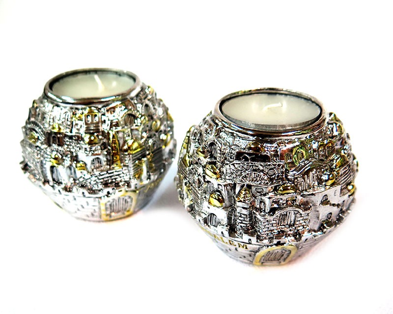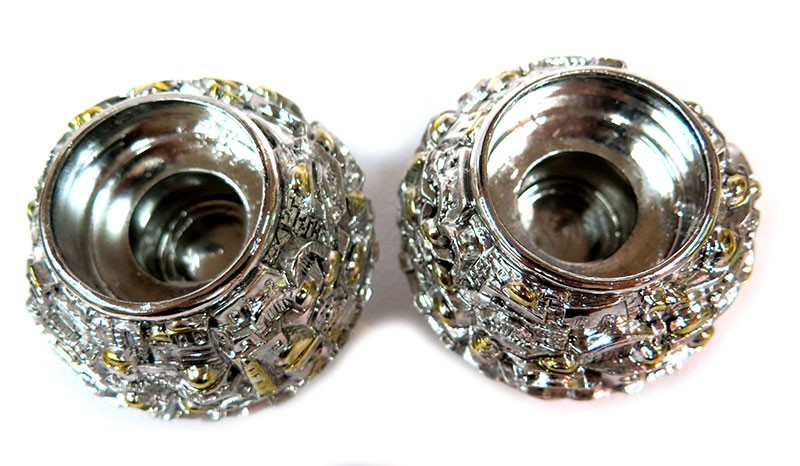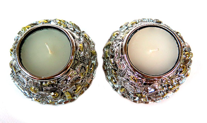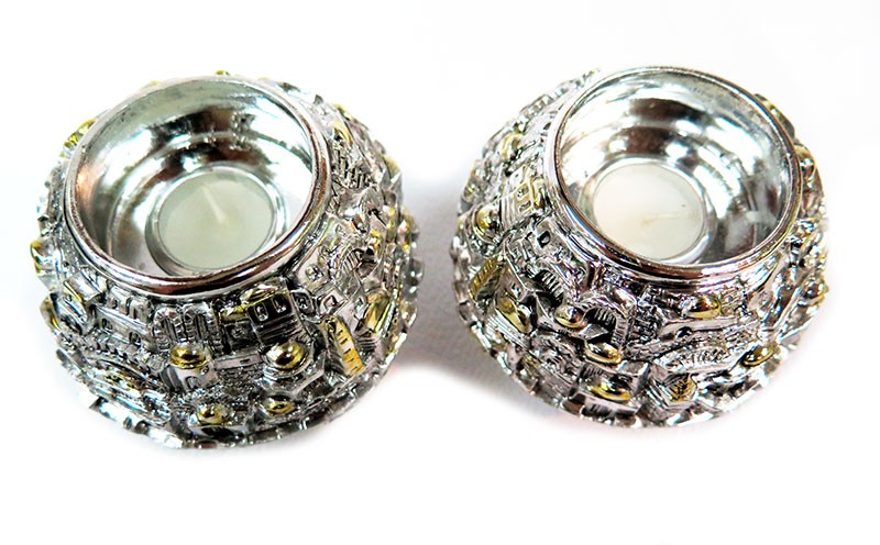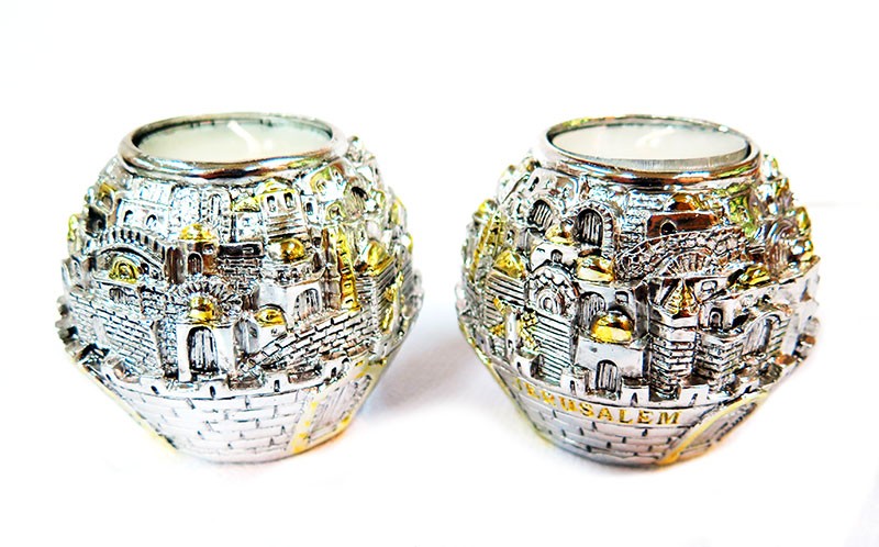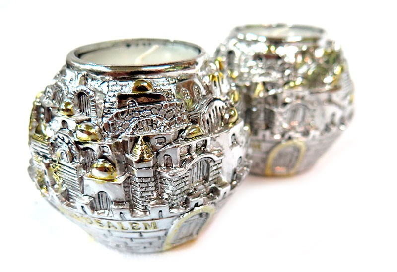 Silver electro-forming candle holders, made by the famous Karshi brand. Jerusalem walls.