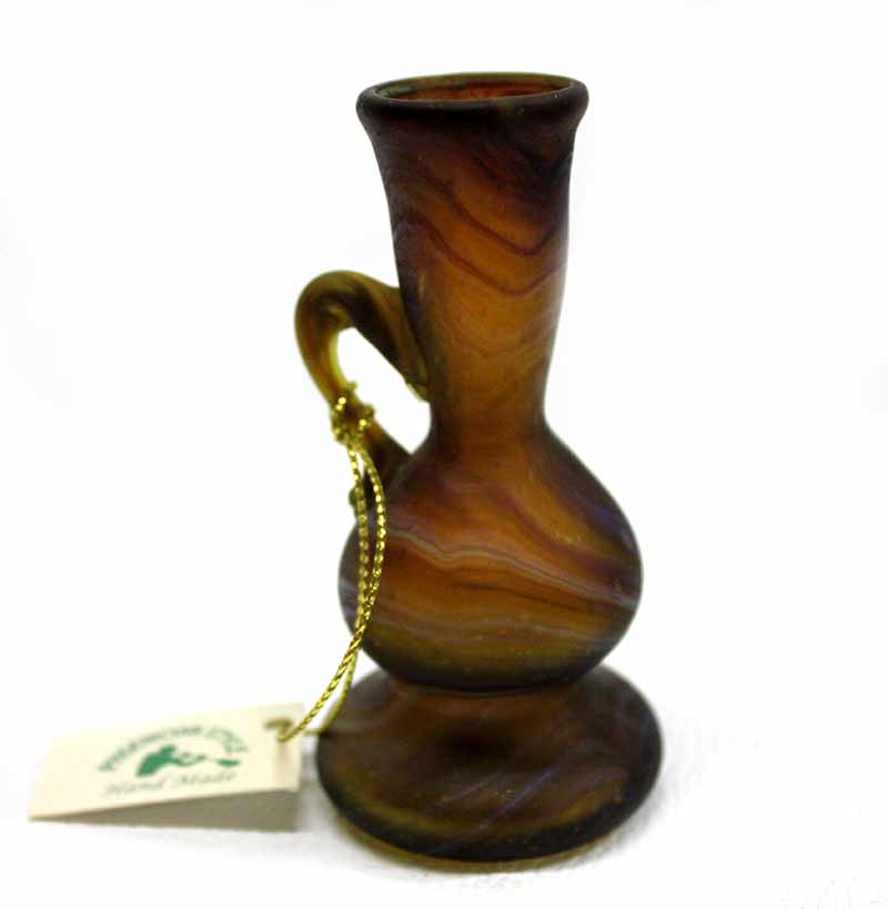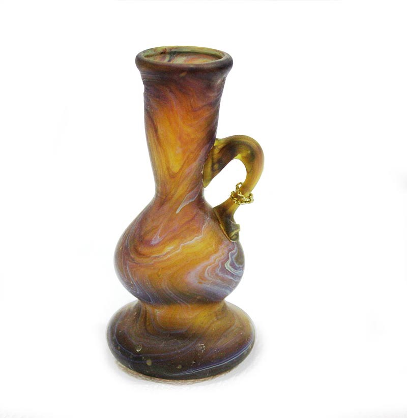 This distinctive glass vase was hand-blown in Israel, in the style of ancient Phoenician glass. Shadowy blues, purples, and blacks swirl around this handsome piece made from recycled bottles.