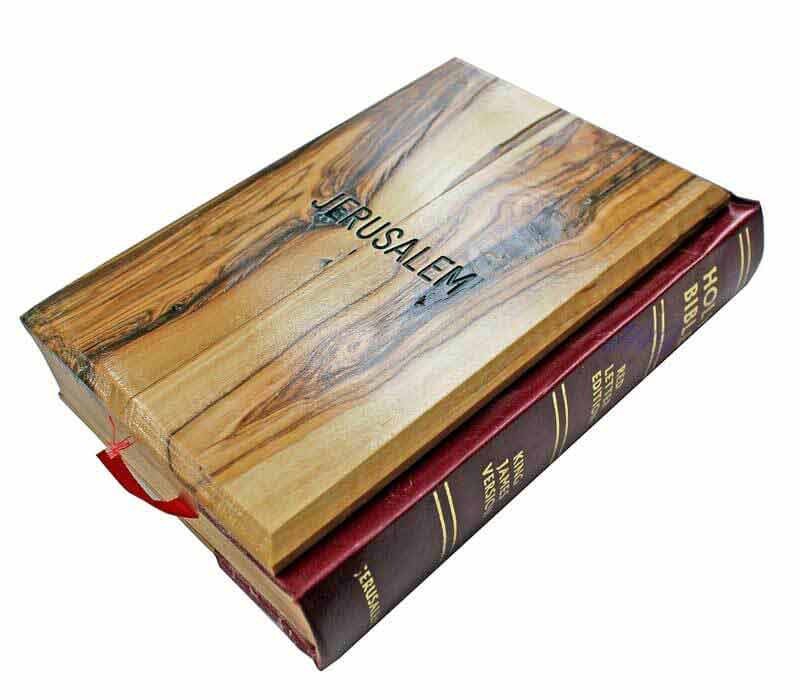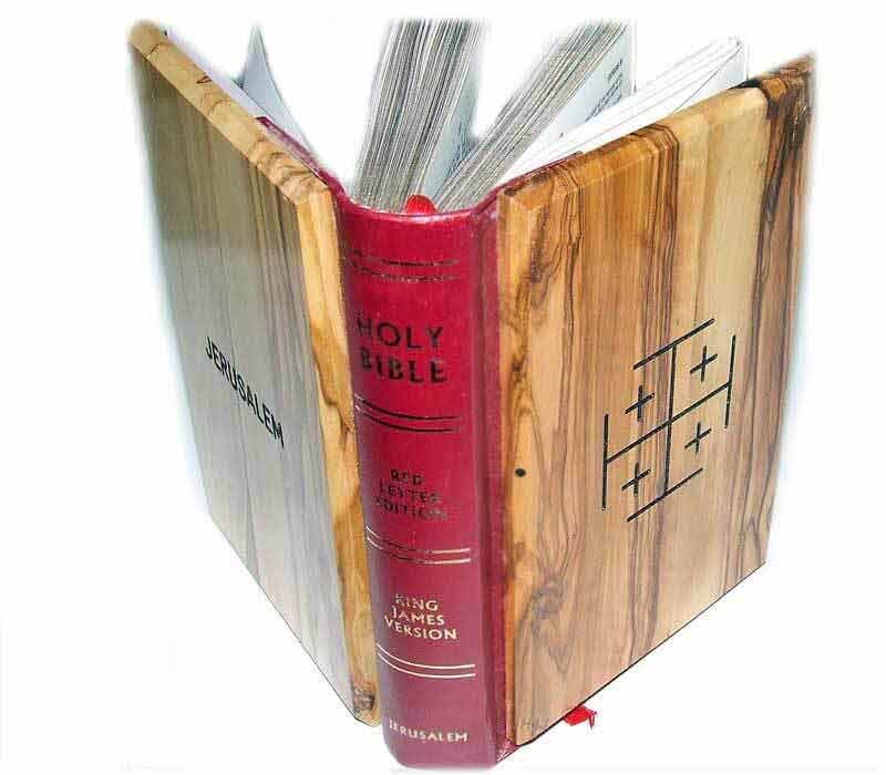 Holy Bible King James version, Bethlehem finest olive wood cover, size: 14.5 x 10.5 cm,(5.8" x 4.2") gold covered pages ( from outside), red letter edition. Jerusalem Cross and JERUSALEM laser engraved on the cover. Available also in Spanish.