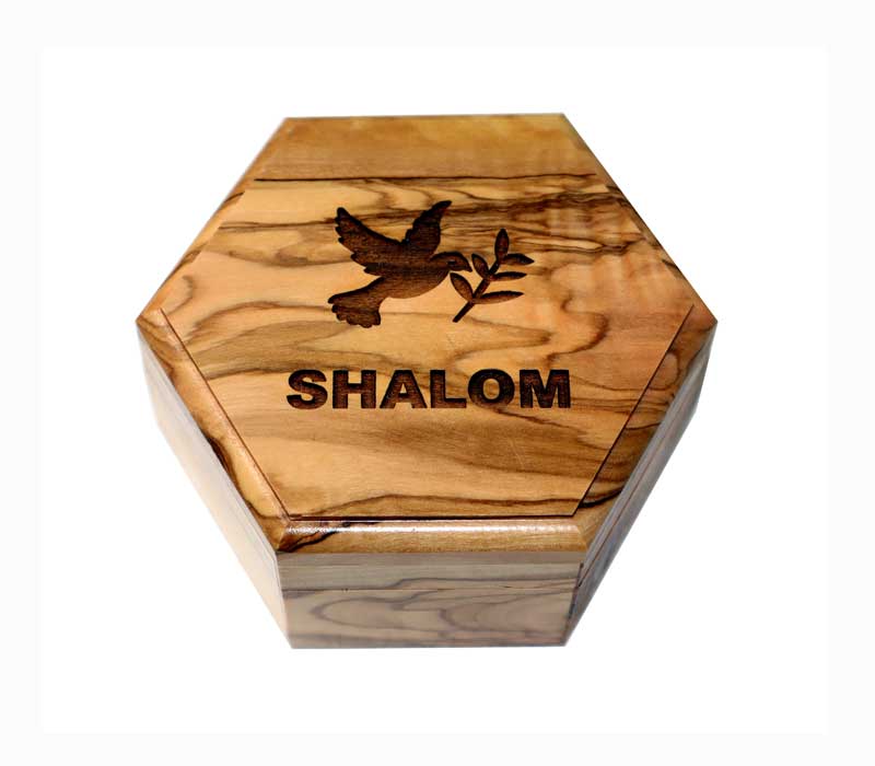 Hexagonal olive wood jewelry box, 9*9 cm. (3.5 Inches) - Shalom Dove Symbol engraved. Hand made in Bethlehem.
