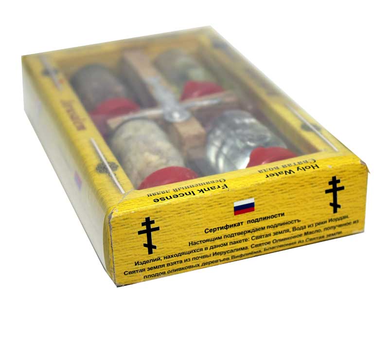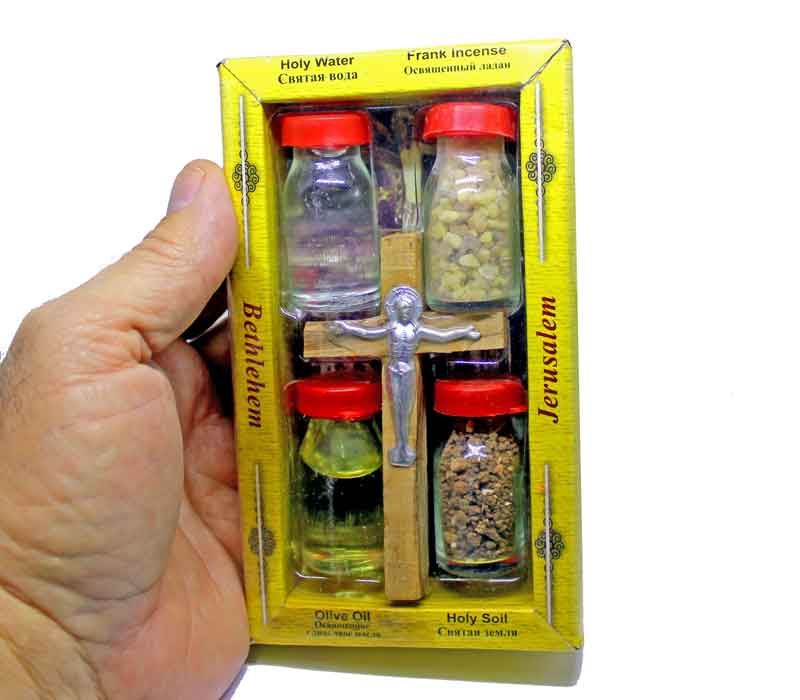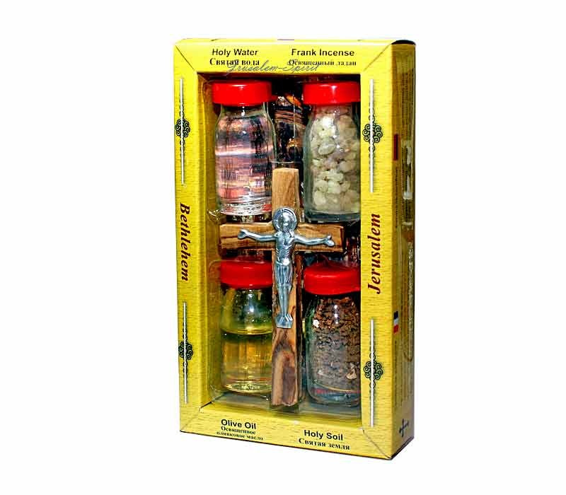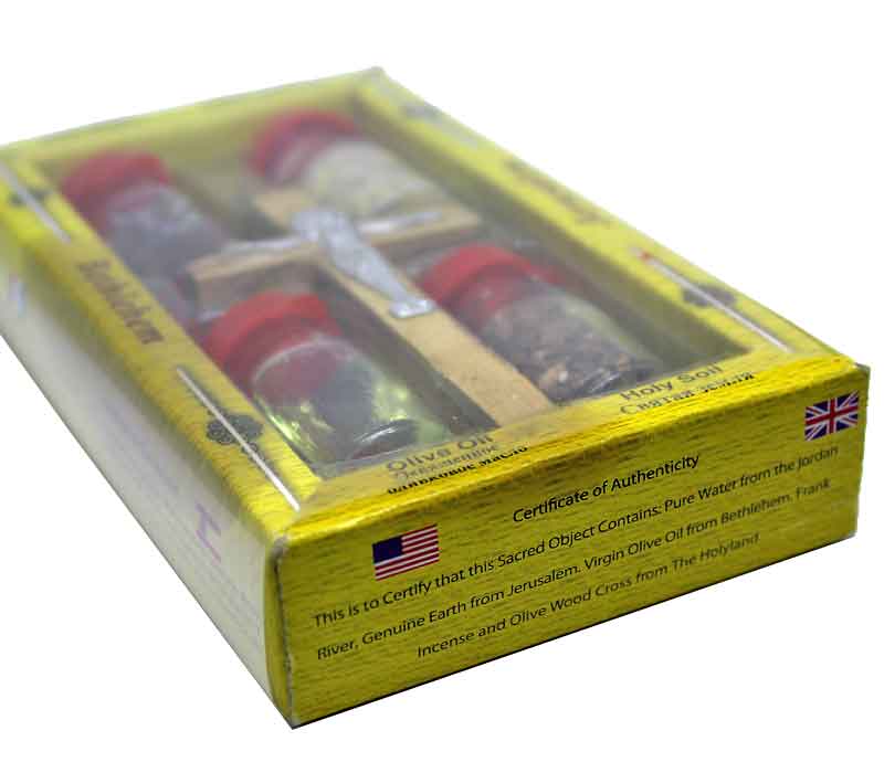 Souvenir Set – 4 bottles with Jordan river Water, FrankIncense, Jerusalem soil and olive oil - including olive wood Crucifix, Size: h 14.5 x 8cm. (6 x 3.5 inches) Weight 150gr. Made in Bethlehem.