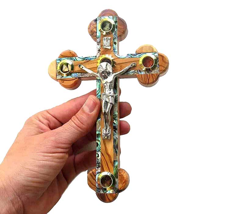 Special Crucifix with Mother of Pearl and Jerusalem star. Made from Olive wood from Bethlehem with 4 window souvenirs: Flowers, stones, incense and soil from Jerusalem. Size: 17.5 cm , 7 inches
