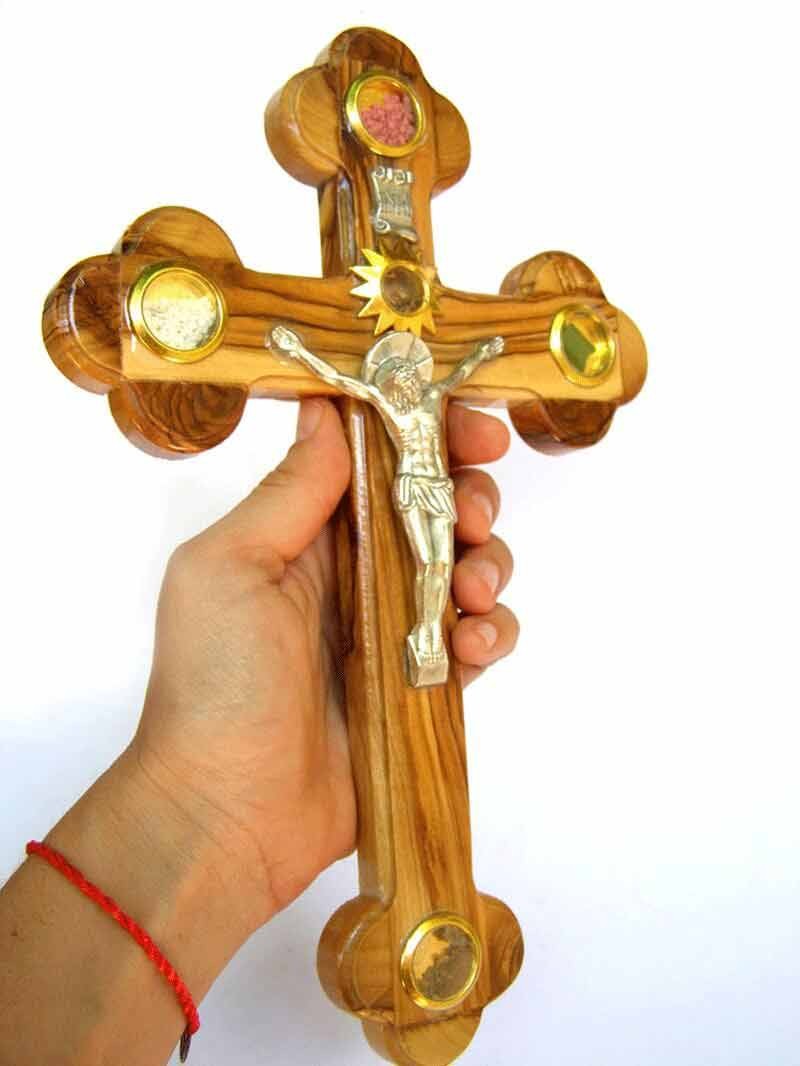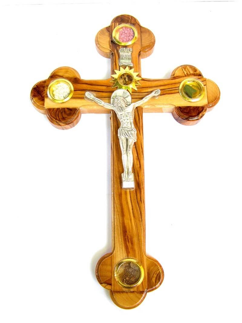 Olive wood Crucifix from Bethlehem, size 27.5/18 cm 4 souvenir tubes ( soil, stones, incense and flowers) from Jerusalem
