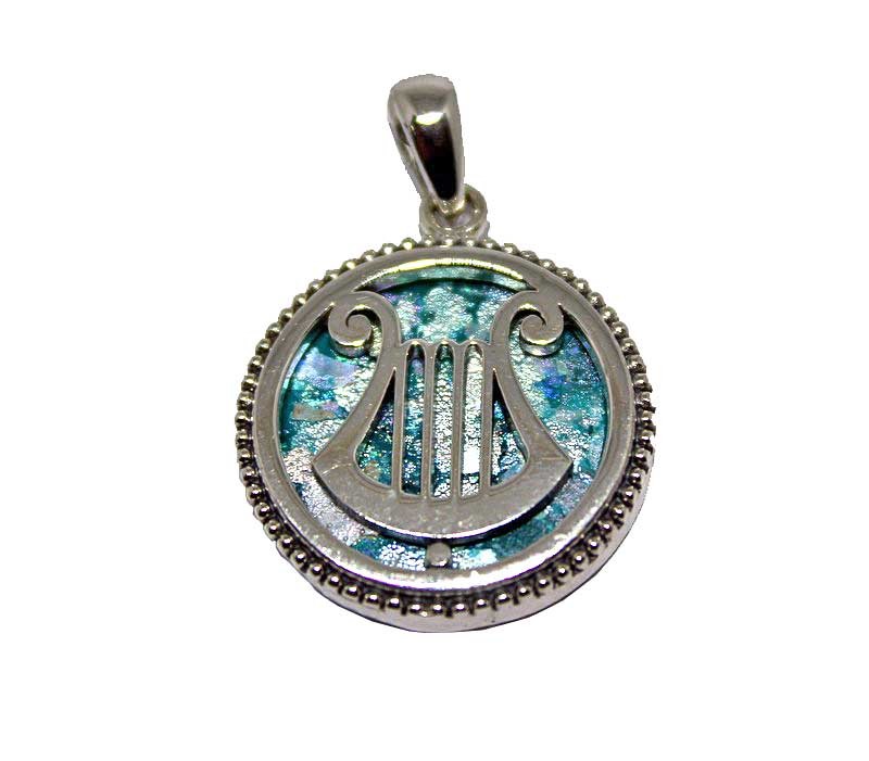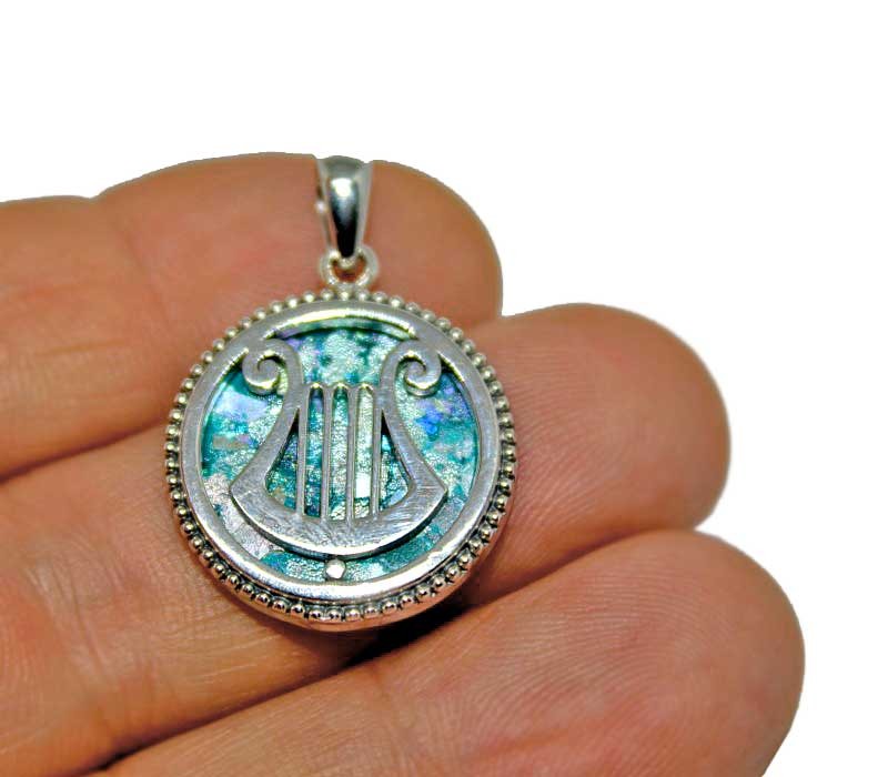 Silver pendant with King David harp and original Roman glass, size 2.2 cm, 0.9 inches, Free shipping