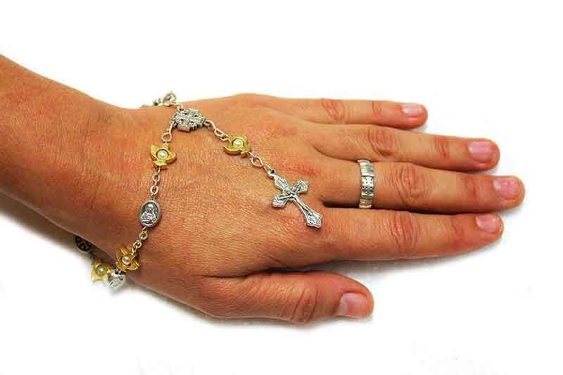 silver-tone Virgin Mary, Jerusalem Cross center,