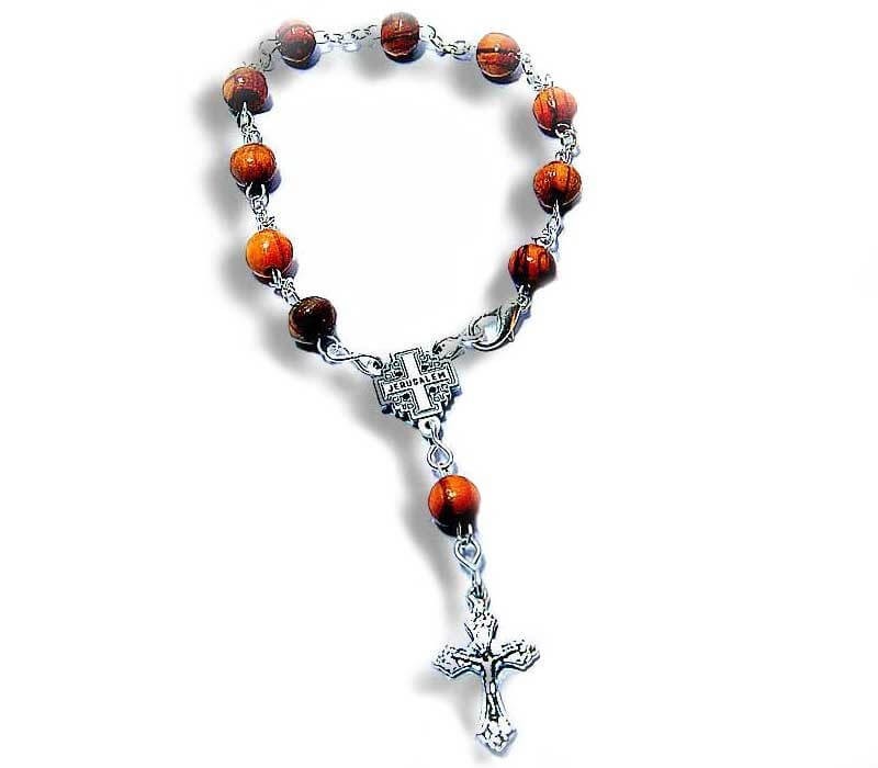 Jerusalem Cross center bracelet rosary, olive wood beads, one-decade rosary bracelet, silver-plated - Free shipping. Made in Jerusalem.