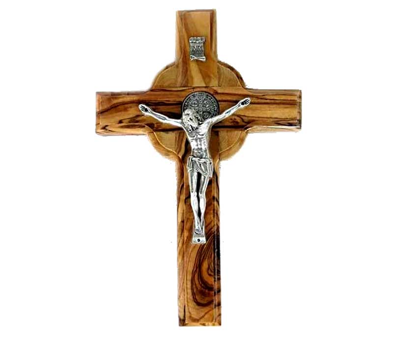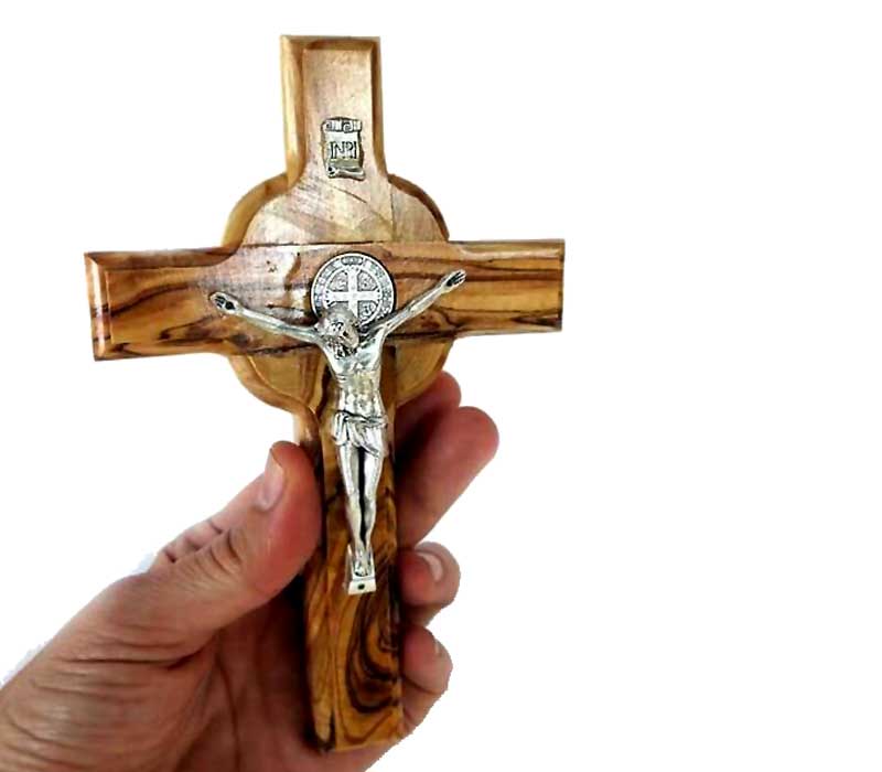 St. Benedict Cross, Olive wood - Hand made in Bethlehem, size 16 cm- 6.5 inches. Real metal nails, 2 St. Benedict coins plated silver. Metal parts are